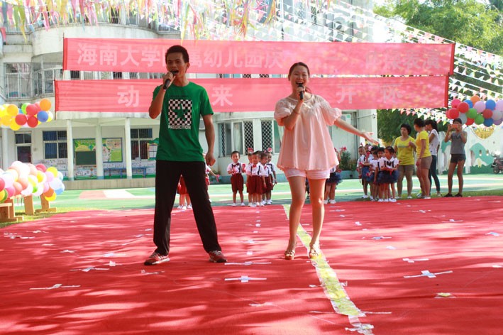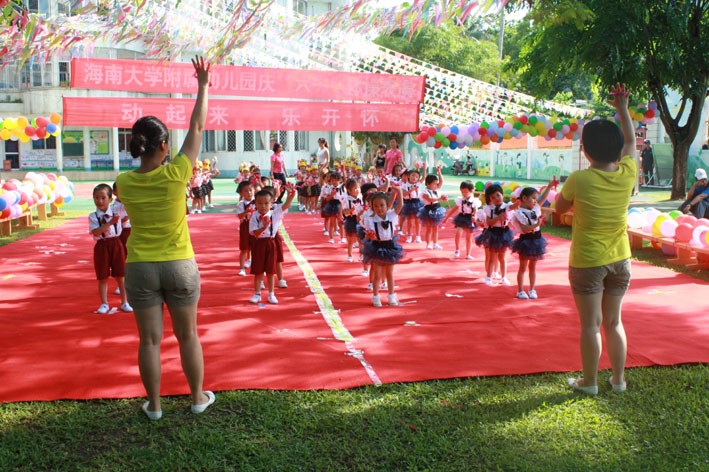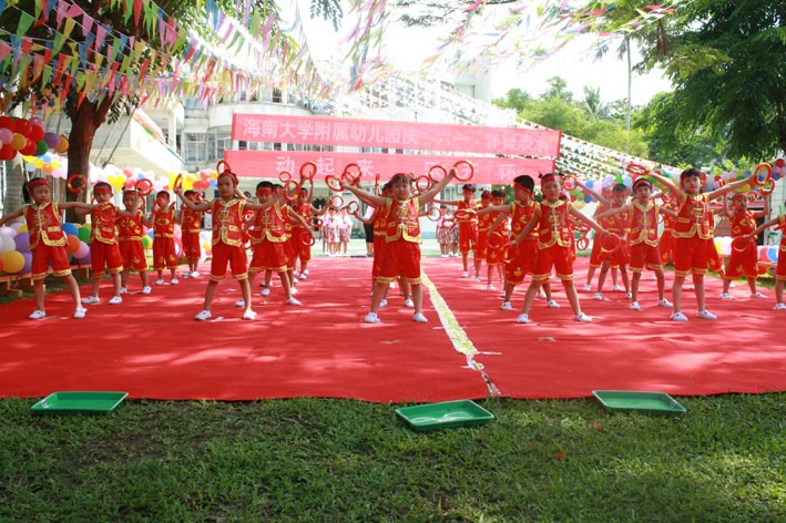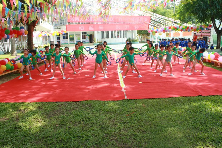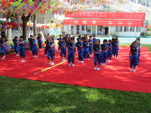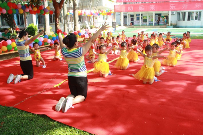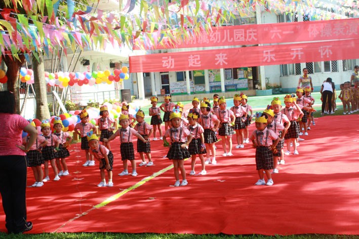 2014年5月30日上午在花朵飘香的季节里,在彩旗飞扬、欢声笑语的喜庆中,yl7703永利附属幼儿园开展以“动起来,乐开怀”为主题的庆“六一” 体操表演。全园400余名幼儿和教师齐聚幼儿园户外草坪,共同欢庆 “六一” 儿童节。整个园内沉浸在一片浓浓的节日气氛中,早上9点正式开始表演,詹春容园长六一致词,同全园幼儿进行了精彩互动,亲切地表达了对小朋友的节日问候和祝福。表演在主持人《快乐你懂得》的歌声中拉开帷幕。首先出场的小班幼儿带来的表演《披萨》《冰糖葫芦》《身体音阶歌》精彩纷呈,稚嫩的动作可爱的小脸让人忍俊不禁为他们欢呼。接着中班组服装造型别具特色,尽展蓬勃向上的风姿和阳光健康的风采,他们时而拉手、时而转圈、时而变成火车钻山洞……在音乐节拍中配合默契,为我们带来的表演《洗澡歌》《大家一起喜洋洋》功夫表演《黄种人》把现场的气氛推向了高潮。紧接着大班组表演形式多样、道具各显特色的体操《跳动的旋律》《We Are The Champion》《亲亲猪猪宝贝》《中国功夫》《快乐爵士》小朋友们精神抖擞,朝气蓬勃。