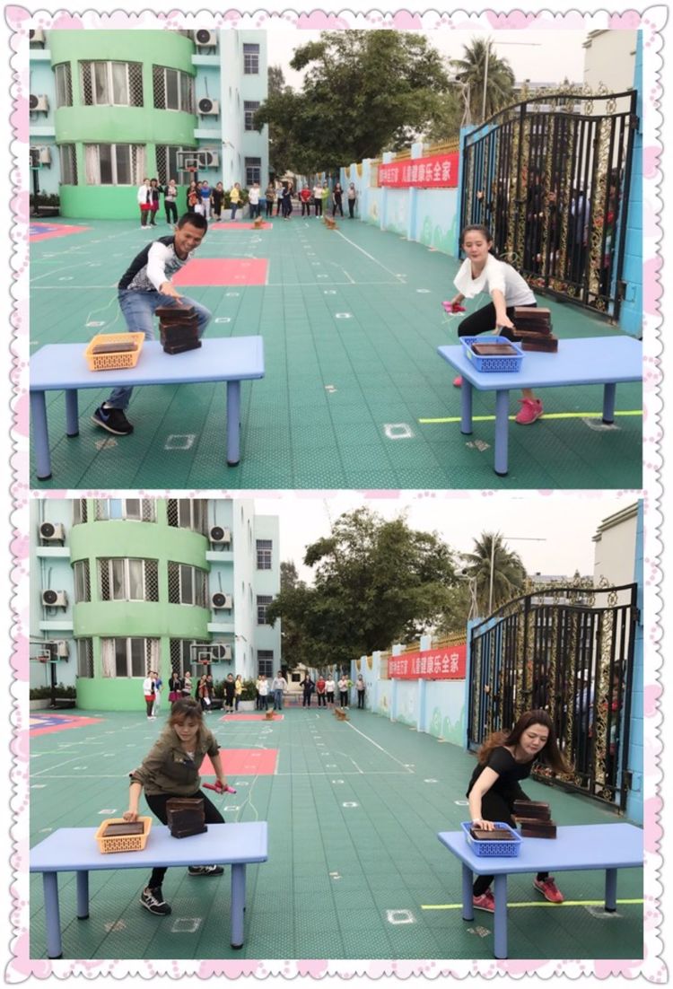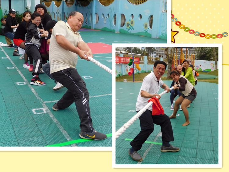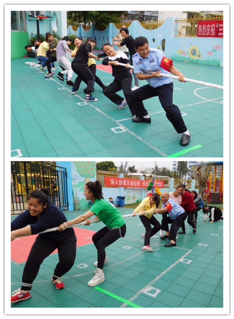 拔河比赛是我园历来的传统游戏项目,随着一声哨响,大家鼓足干劲,抓紧绳索。脸憋红了,手磨青了,腿打颤了,可谁都不肯放松一步。团队完全融为一体,心往一处想,劲往一处使,比赛场面异常激烈。