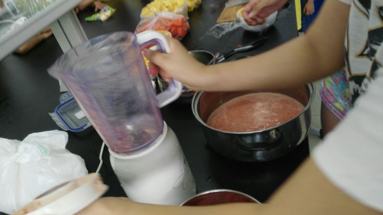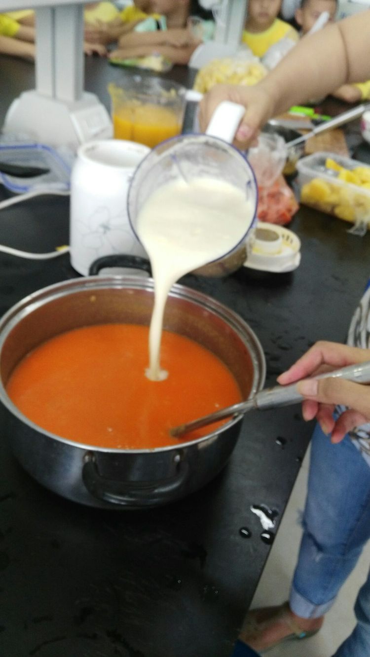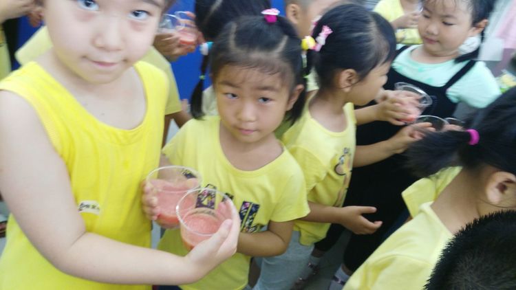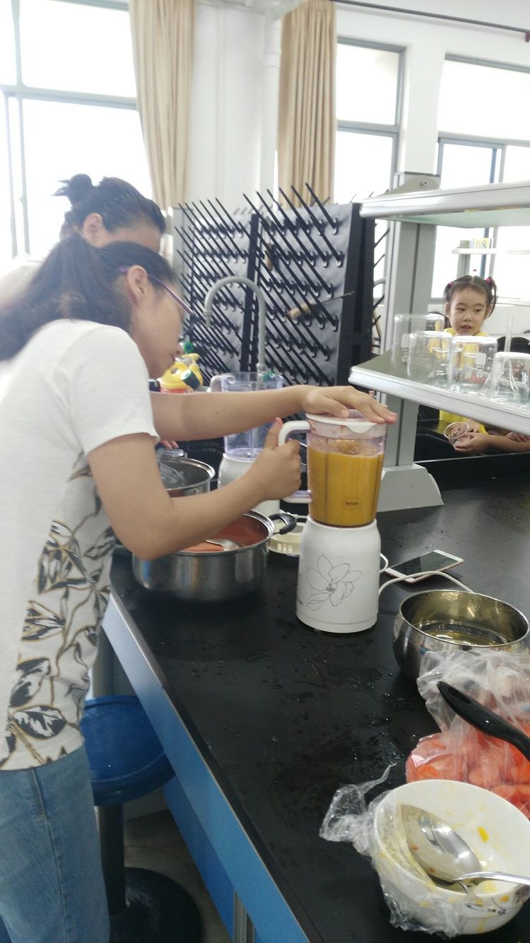 请看:这就是西红柿汁,颜色有什么不一样呢?西红柿原来红彤彤的颜色,现在变淡了,没有原先的红