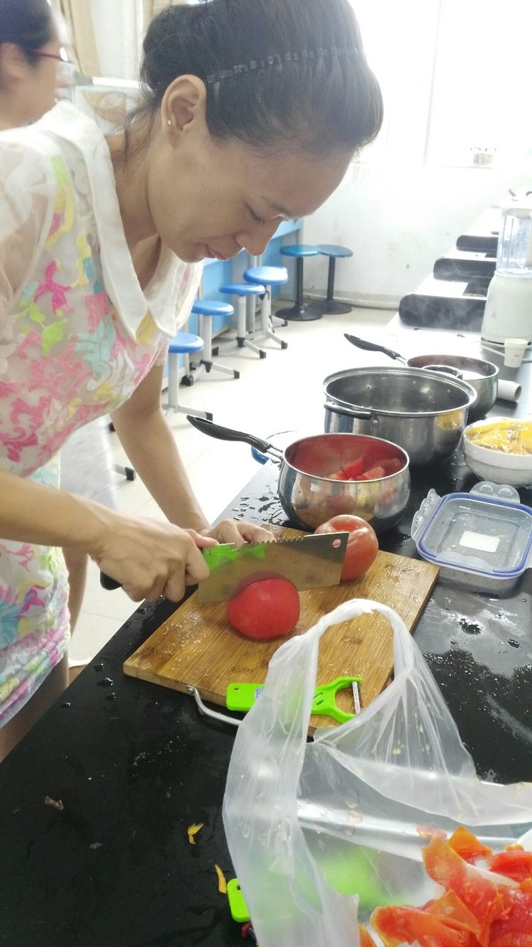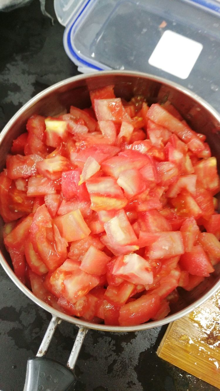 西红柿用开水去皮后~然后切块!