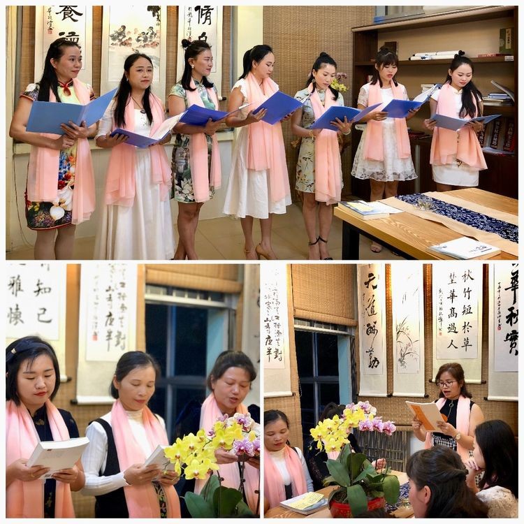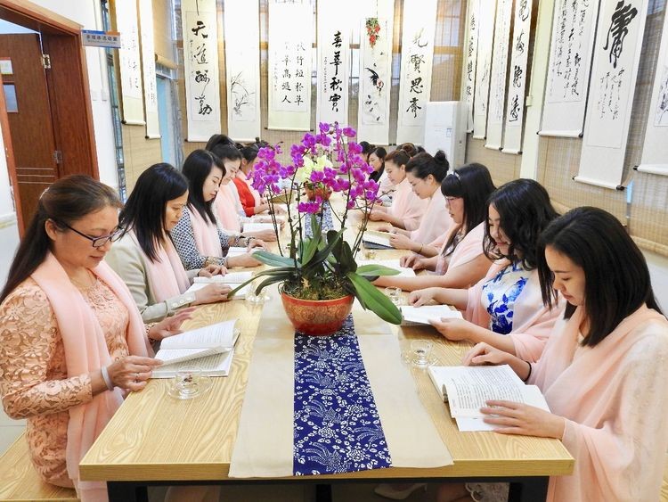 书画坊内悠扬的古琴声伴随着茶香、花香、书香静候着女神们的到来。