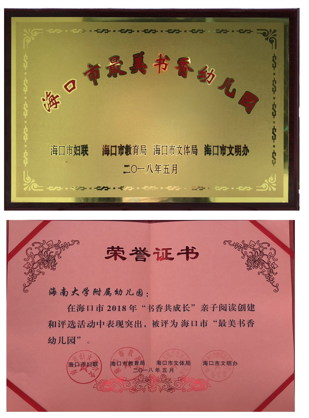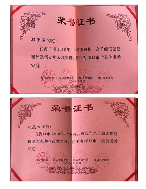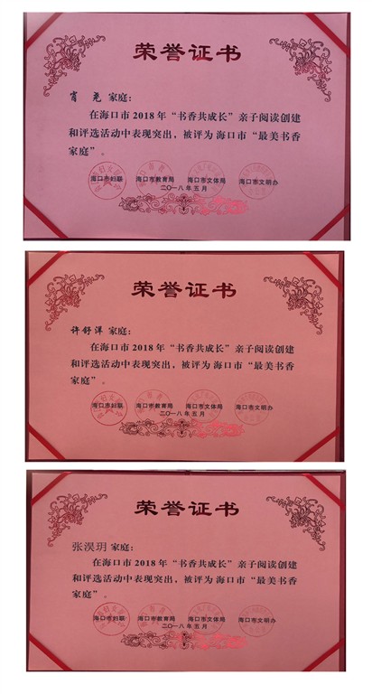 经评选,海口市妇联、市教育局等部门授予yl7703永利附属幼儿园2018年“最美书香幼儿园”,耿元心家庭、肖尧家庭、许舒洋家庭、张淏玥家庭、郑泽瑞家庭荣获2018年海口市“最美书香家庭”荣誉称号。