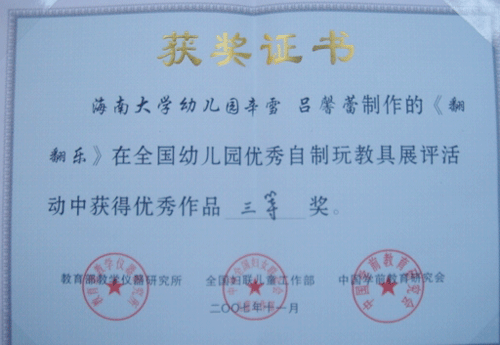 2007年11月21日,教育部教育仪器研究所、全国妇联儿童工作部和中国学前教育研究会在北京联合举办的全国幼儿园优秀自制玩教具展评活动。我园黄金灿、陈杨柳、王海霞三位老师制作的《拉线小竹子偶》和辛雪、吕馨蕾两位老师制作的《翻翻乐》等两件作品,代表海南省参加展评活动,被分别评为二、三等奖。